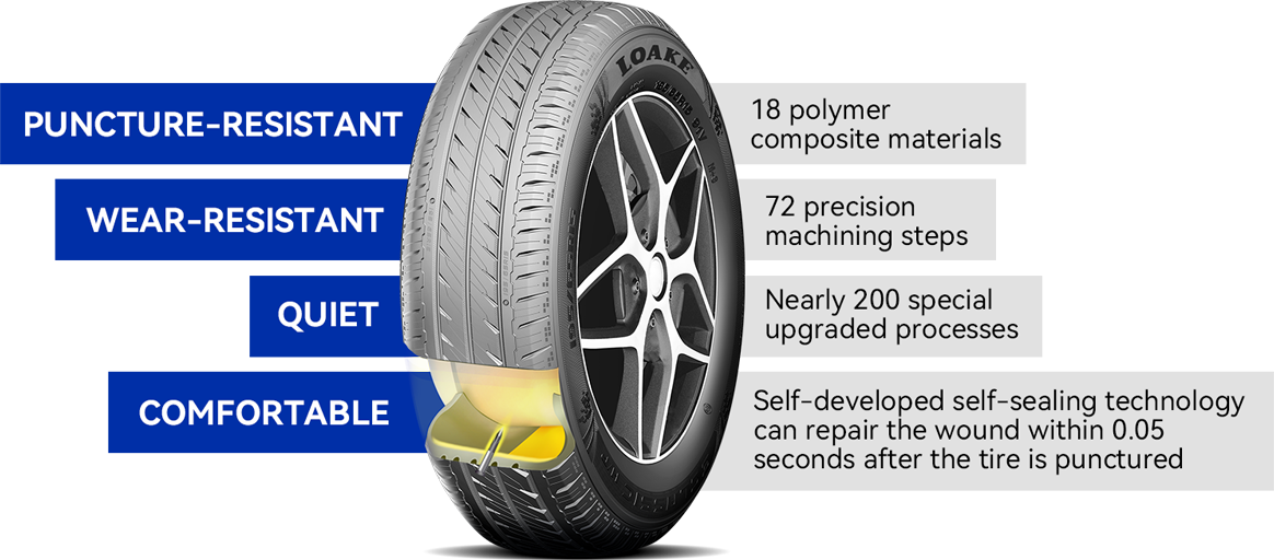 At KOLLEB, we offer a revolutionary solution in road safety through LOAKE tires, which are puncture-proof and resistant to resulting blowouts. Featuring Italian technology and developed to the latest standards in China, we provide you with a product that combines the highest levels of quality, safety, and comfort. LOAKE tires are safe, puncture-resistant, and blowout-proof, with self-healing capabilities that repair punctures within just 0.05 seconds. They are manufactured using patented nanotechnology that forms a highly saturated flexible inner layer 4–5 mm thick, which automatically seals punctures within fractions of a second—making them the ideal choice for modern roads and harsh conditions.